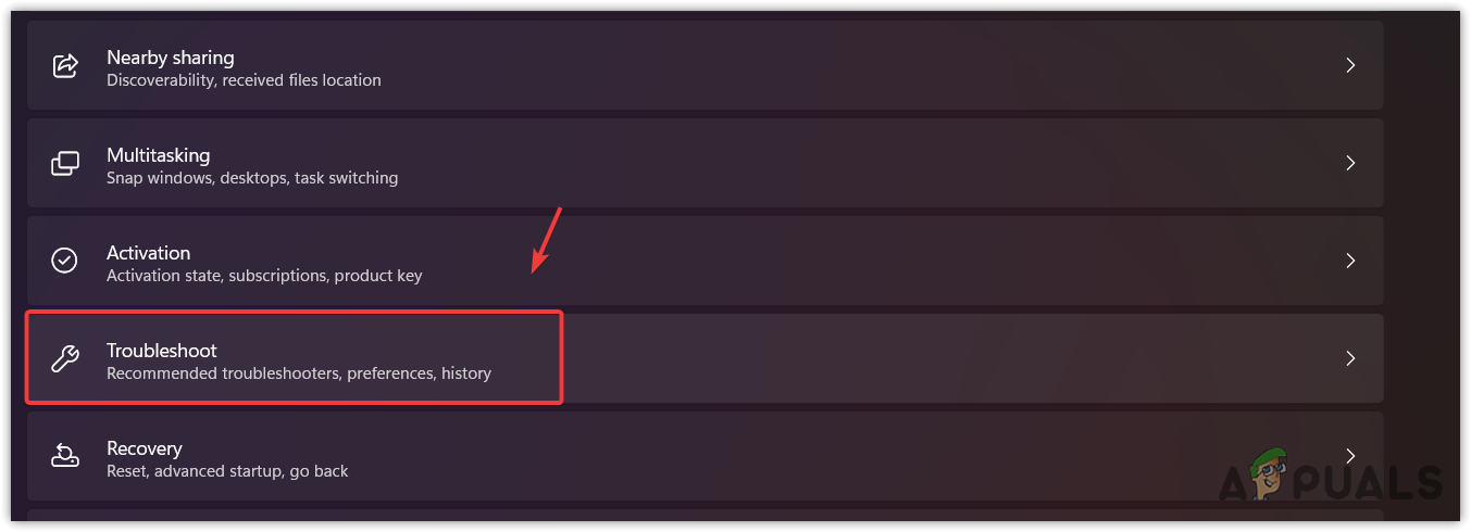 2. Once the settings is opened, navigate to Troubleshoot > Other troubleshooters. Navigating to Troubleshoot settings