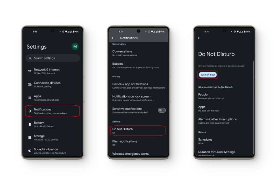 Your next step should be to check if a setting is intentionally stopping your phone from showing incoming call notifications. Specifically, check if Do Not Disturb (DND) or Airplane mode is turned on. DND mutes all alerts, including calls and texts. Airplane mode disables all wireless and cellular signals.