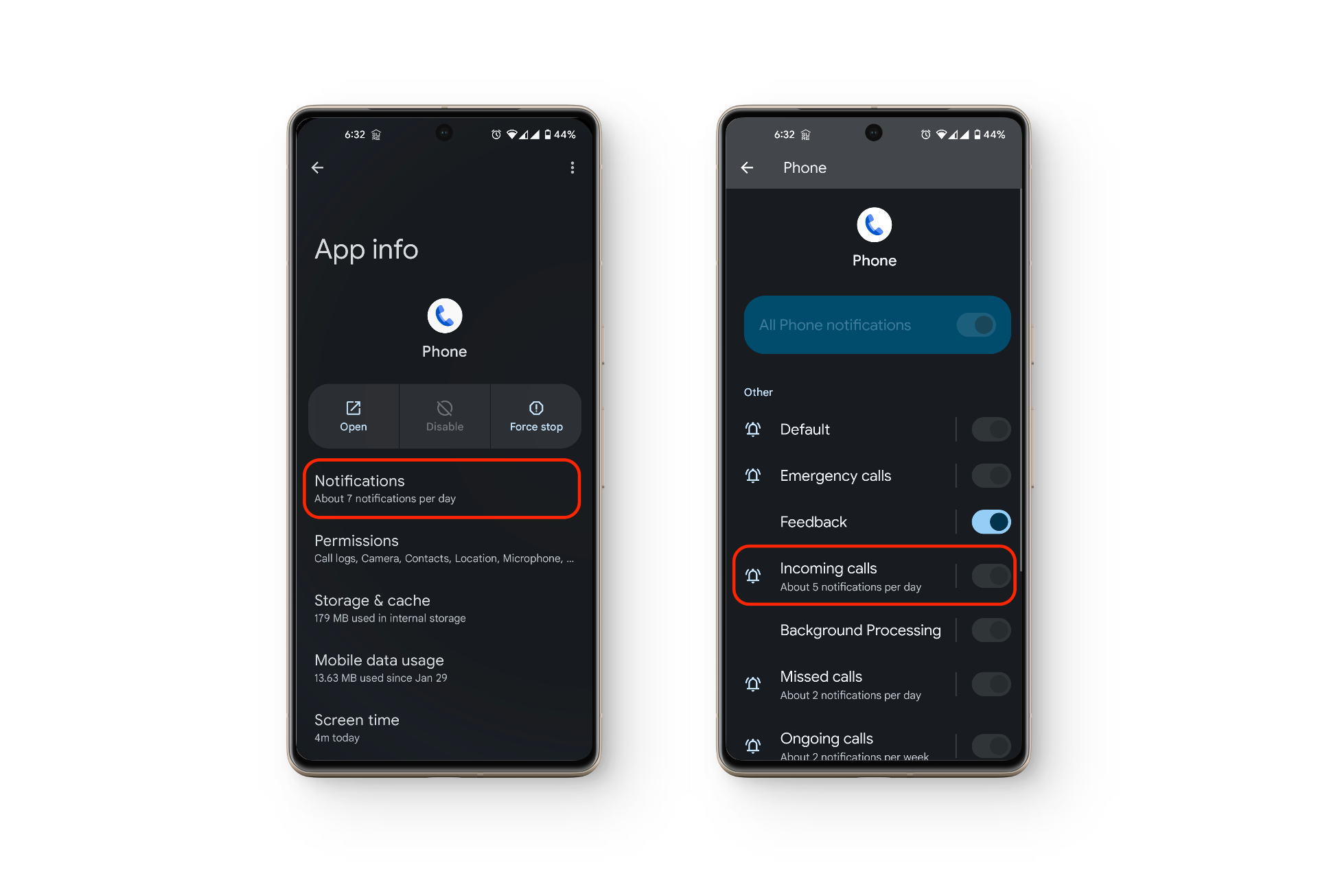 6. Ensure the toggle for “Incoming calls” is turned ON. Phone app’s notification Settings