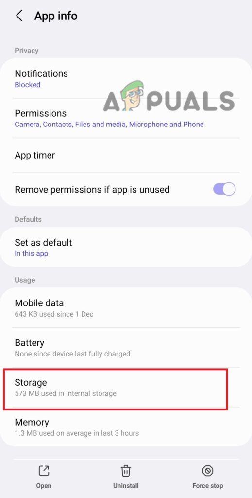 4. Navigate to Storage on the app info page. Tap on the Storage option