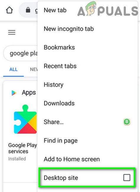 Search for Google Play Services in Chrome - Tap the three vertical dots in the top right and check Desktop Site.
