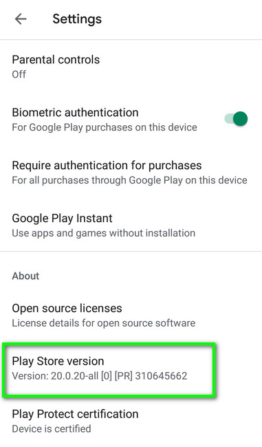 Tap on Play Store Version - If an update is available, install it. If not, you’ll see a message saying Google Play Store is up to date.