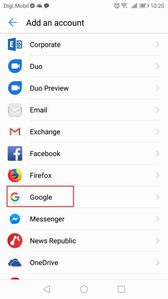 - Then, from the Add an account window, tap on Google and follow the on-screen instructions to re-add your Google account.
