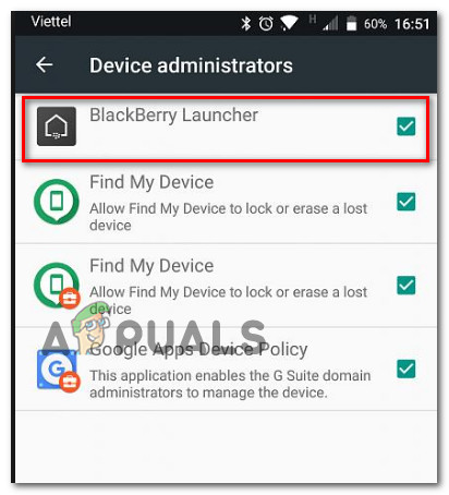 - Blackberry Launcher doesn’t have admin privileges – This scenario is exclusive to Blackberry Priv devices running Android 6.0+. As it turns out, a system bug might cut the privileges of Blackberry Launcher whenever Google Pay is enabled on the device. In this case, you can resolve the issue by disabling the admin access of Google Pay and enabling the admin access of the Blackberry Launcher.