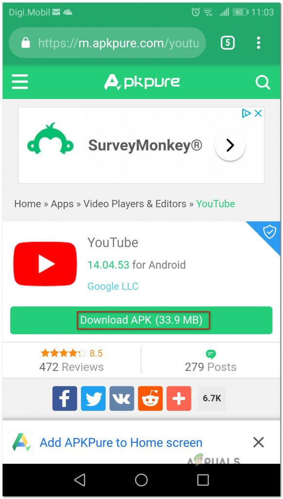If none of the potential fixes above worked for you, you might want to start considering the possibility of using a third party service to install or update the application that is failing with the ‘Error Code 910’. This procedure will be effective in those scenarios where the issue is caused by some kind of incompatibility or because your current Android version does not support the latest application update.
