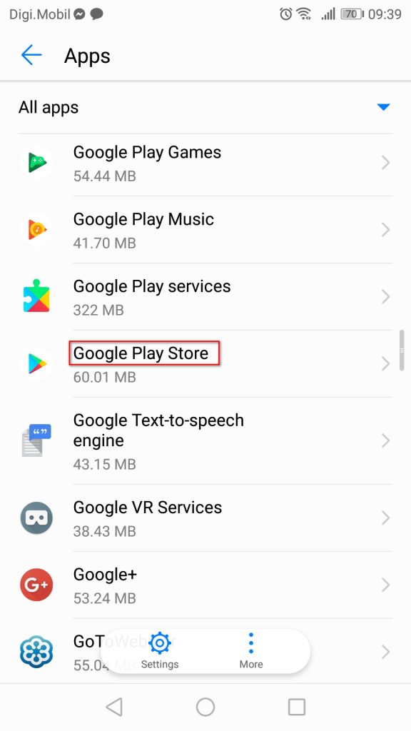 - Scroll through the list of apps and locate Google Play Store. Once you see it, tap on it open.