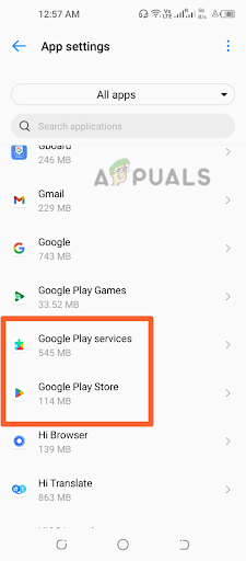 4. Scroll down and find the apps named Google Play Services and Play Store. Tap on them to open their settings. Tap on the Google Play Services and Google Play Store option