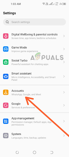 2. Scroll down and tap on the option labeled Accounts or Users & Accounts. Go to the Accounts option