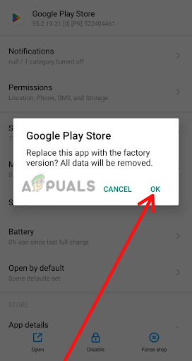 7. A confirmation message will appear on the screen. Tap “OK” to confirm that you want to uninstall updates for the Google Play Store app. Tap OK to confirm