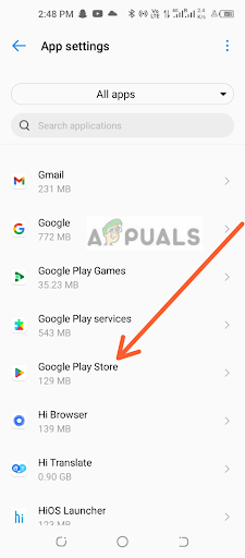 4. Scroll down the list of apps until you find Google Play Store. Tap on it to open the app info page. Tap on Google Play Store
