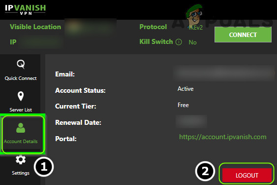 The IPVanish connection issue could be a result of a temporary glitch in the communication modules of your device. The glitch may get cleared if you log out and then log back into IPVanish. For elucidation, we will go through the process for the Windows version of IPVanish.