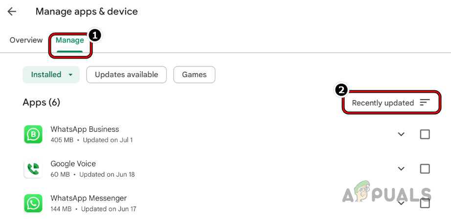 4. Then filter the list of installed apps as Recently Updated, and afterward, uninstall the last 5 to 6 updated apps (one by one). Sort Apps as Per Recently Updated in the Google Play Store