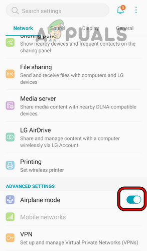 Enabling and disabling the airplane mode of your LG phone may re-establish the phone’s Internet connection, thus solving the problem.