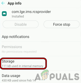 4. Now tap on com.lge.ims.rcsprovider (for some models you may tap on com.qualcomm.qti.ims) and open Storage. Open com.lge.ims.rcsprovider in the App Info