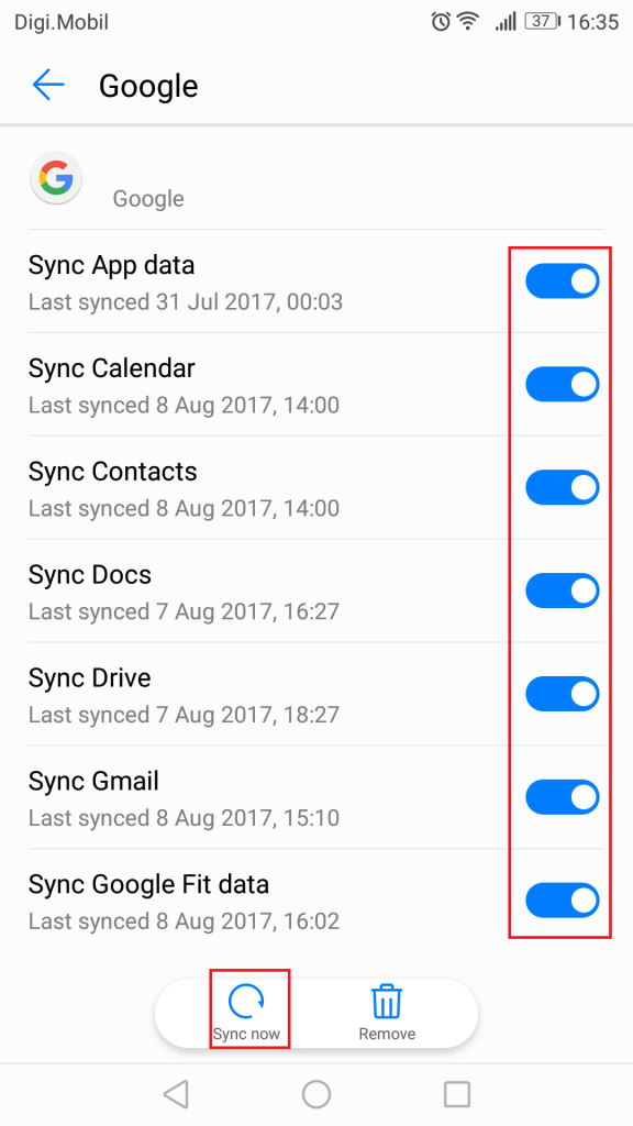 3. Make sure all entries are enabled and hit Sync now. Depending on your phone’s manufacturer, the Sync Now button may be located on the bottom side of the screen or in the top right corner.