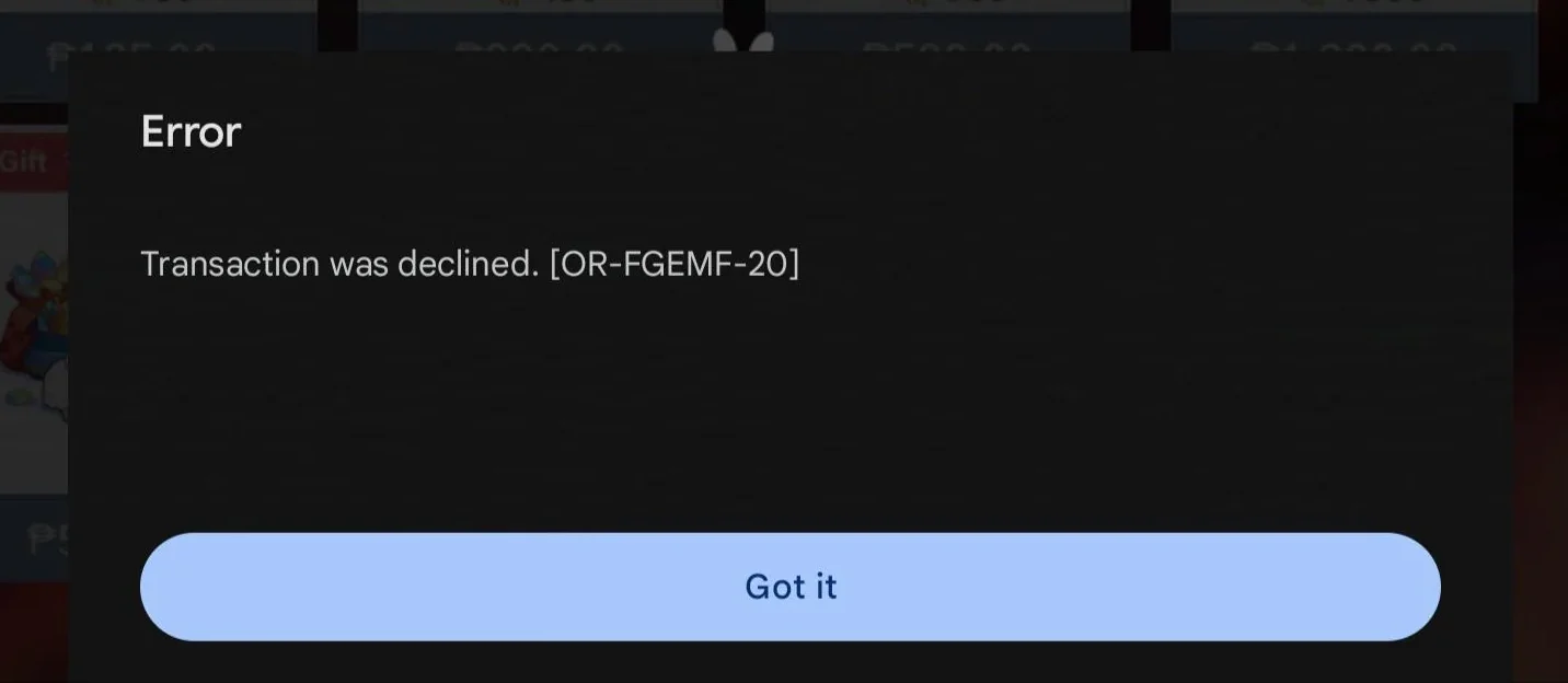 OR-FGEMF-20 on Google Play appears when you’re trying to complete an in-app purchase or subscription. This error prevents the transaction from going through and indicates that Google Play’s payment system has declined your purchase.