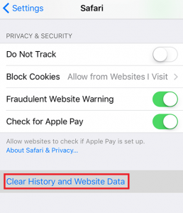 - Go to Settings > Safari and tap on Clear History and Website Data.