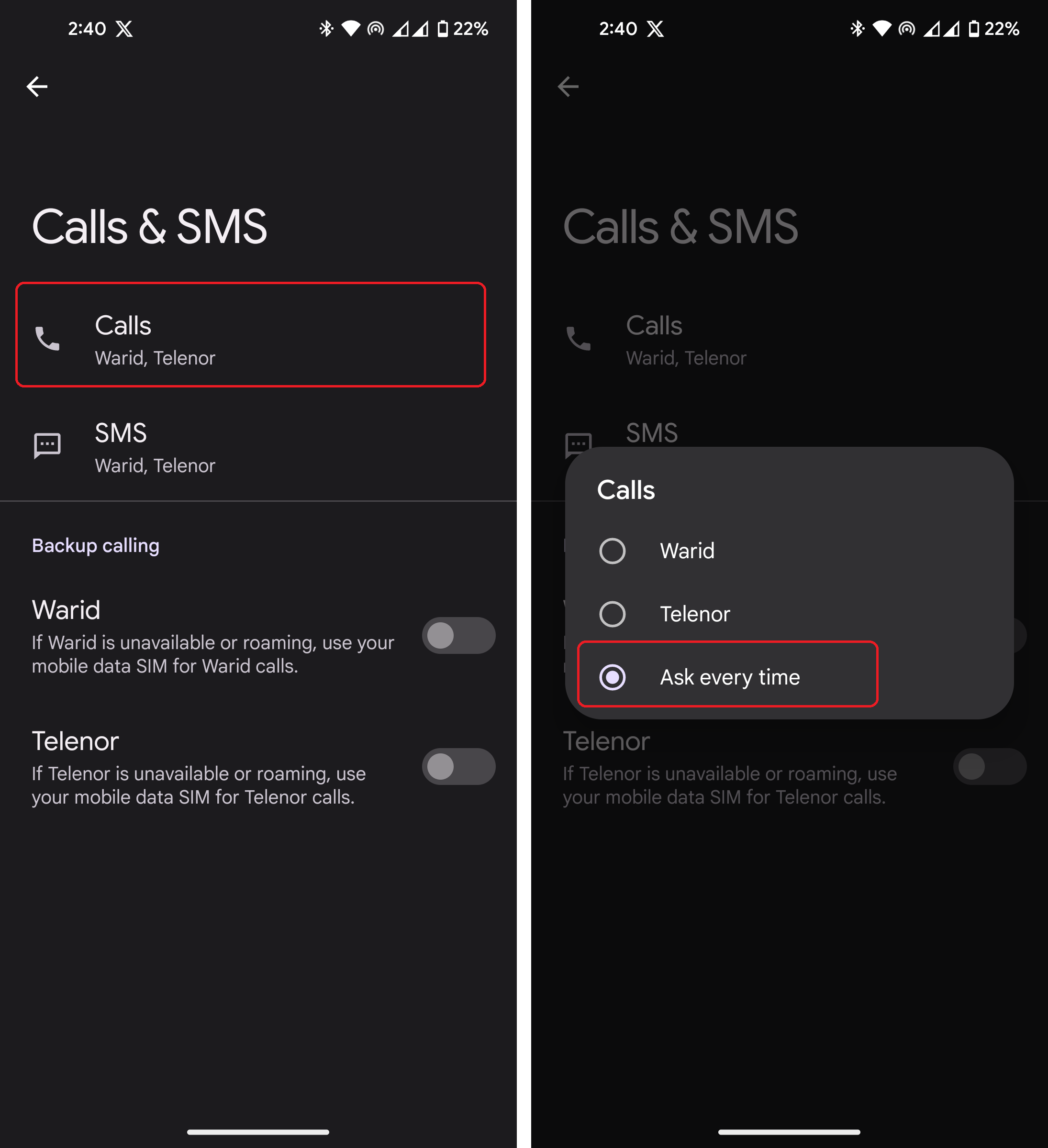 Some phones may not have this functionality. In that case, turn it to “Ask every time,” and if one SIM doesn’t work, try the other one.