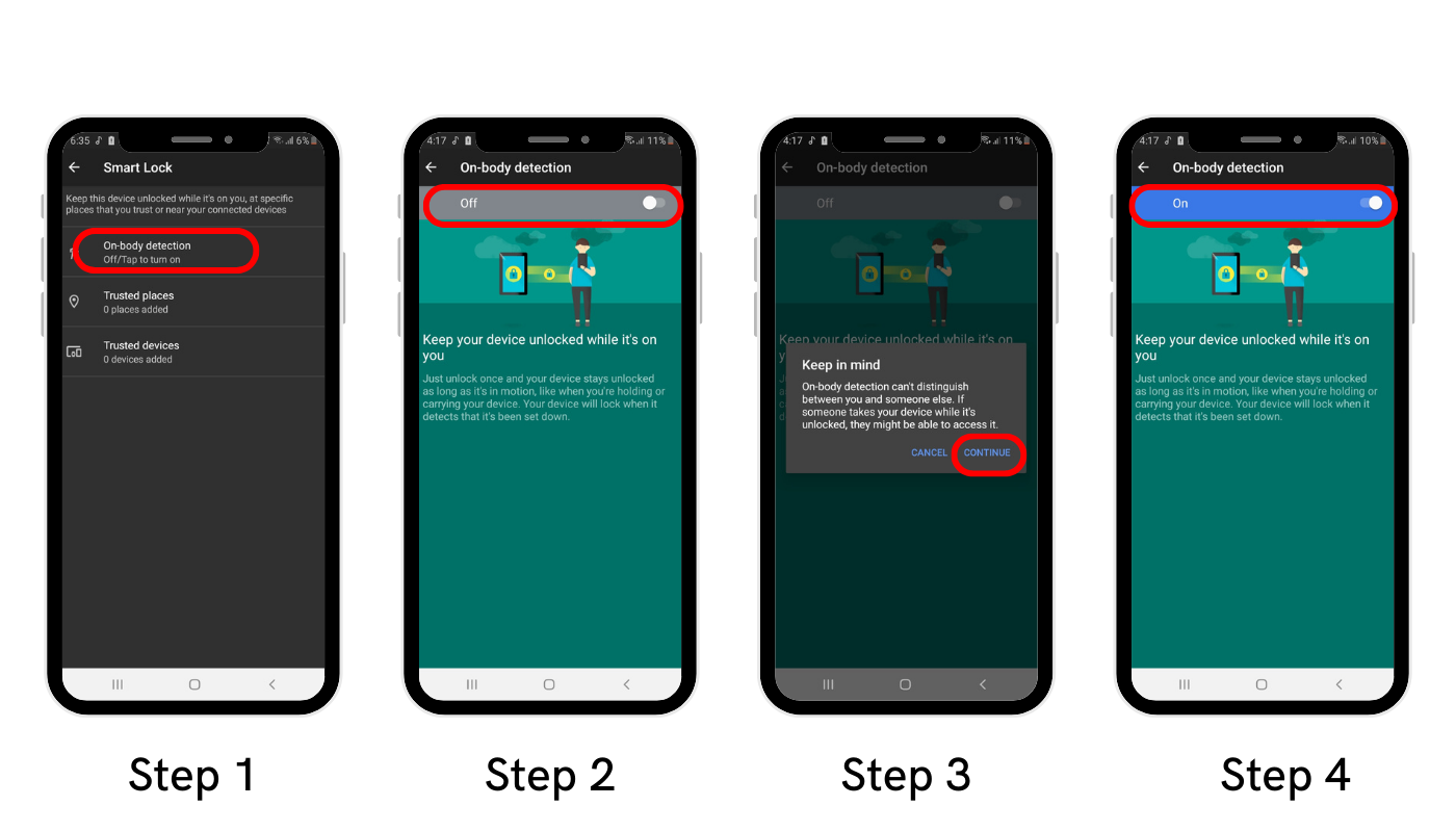 1.On-body detection: When your phone detects that it is in your hands or pocket, it will remain unlocked. Activate this feature by going to Settings > Security > Smart Lock and turning on the button labeled “On-Body Detection.