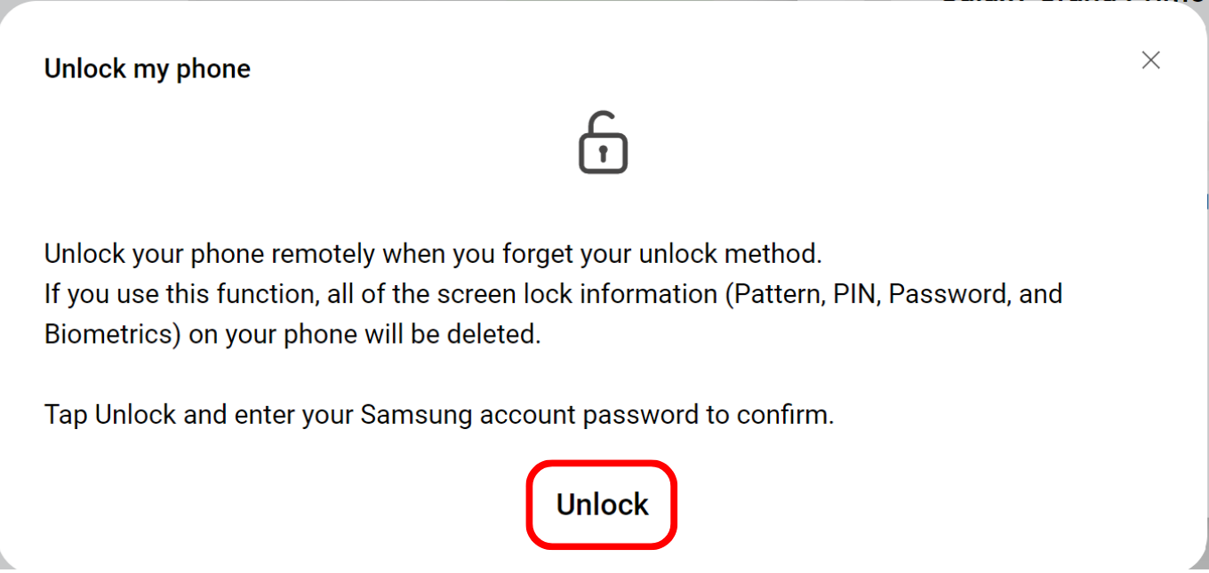Choose your device and select unlock - Choose “Unlock.” Next, you will be prompted to unlock your Samsung device. Click “Unlock” and enter your Samsung Account password to confirm the unlock.