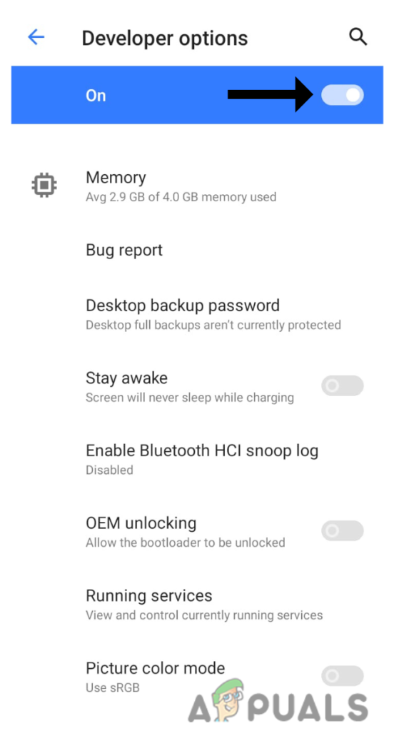 4. Now, Enable Developer options by sliding the toggle switch to the right. Enable Developer Options