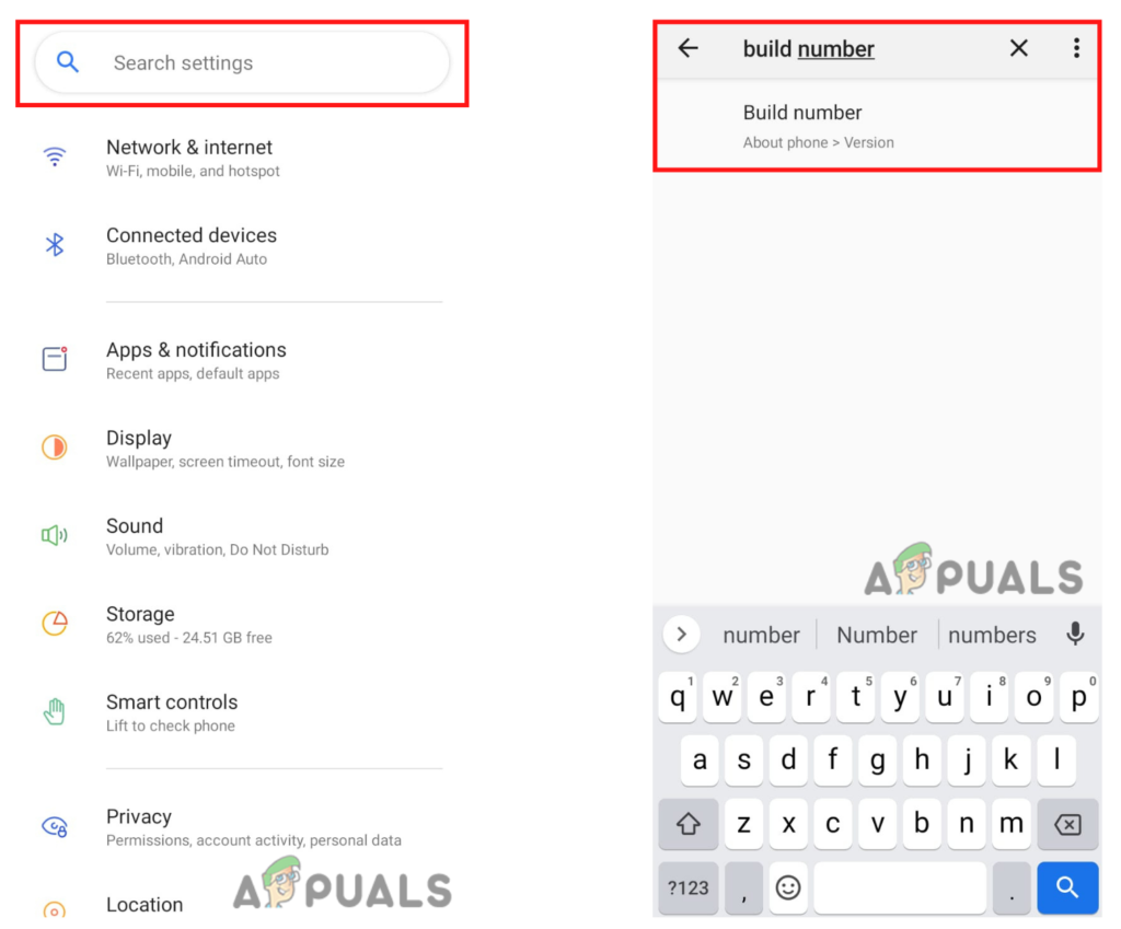 1. Go to Settings and search for Build Number in the search bar. Search for the Build number