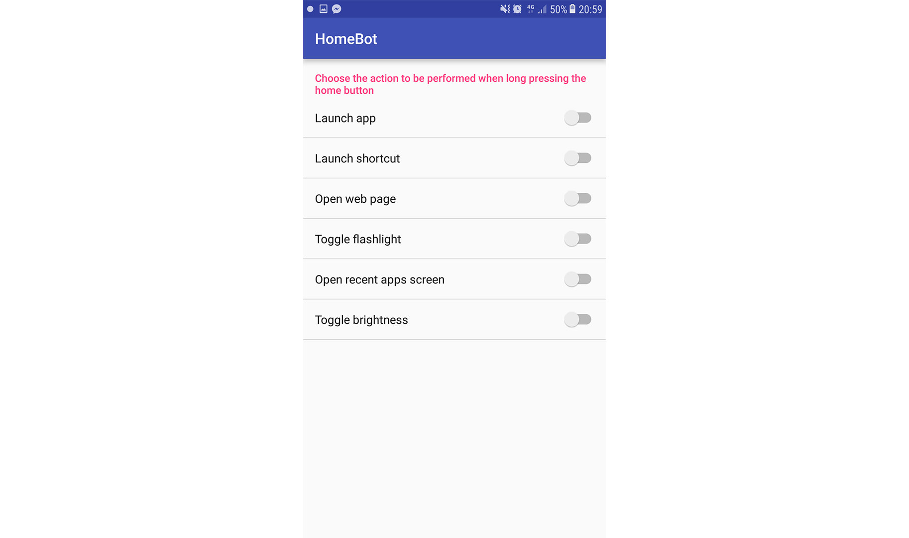 HomeBot allows you to assign one of five predefined actions to your home button. These are:
