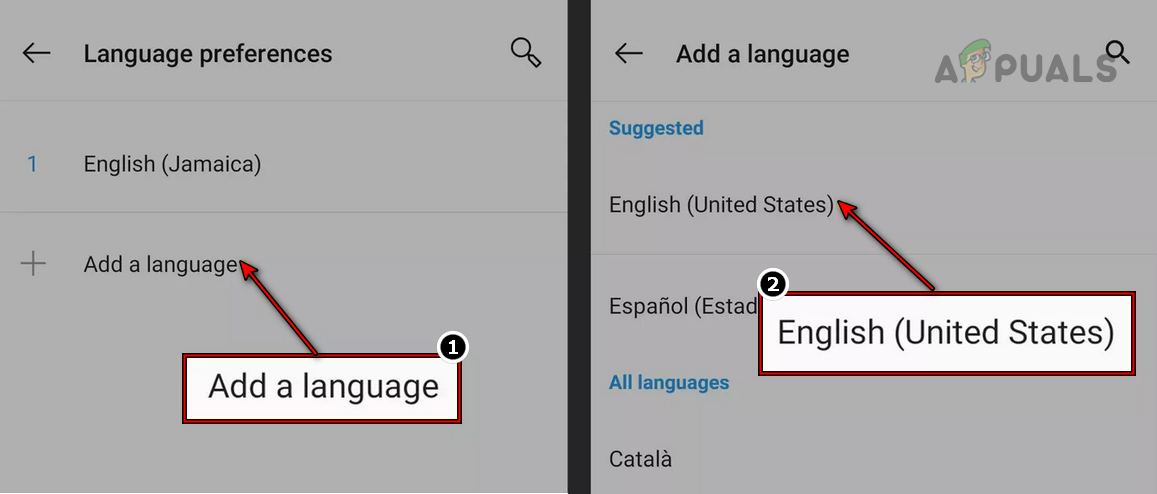3. Then select a language like English (US). If it is not shown, tap on Add a Language and select English (US). Add English (United States) in Android Languages