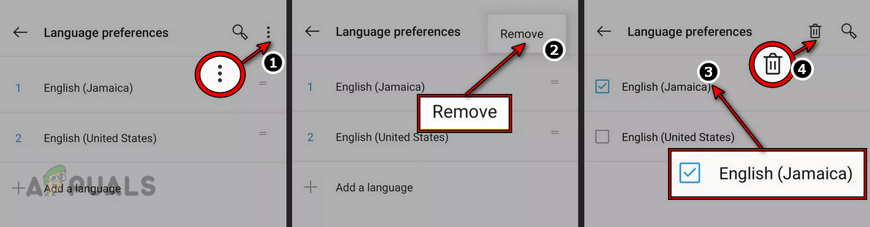 7. Then select all the other languages except English (US) and tap on the Trash icon. Remove Secondary Languages from the Android Phone