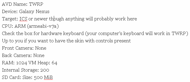 Compile a recoveryimage using those device files. In the Android SDK, click on Tools -> Manage AVDs. Click New. Set it up as the following: