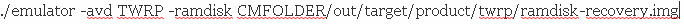 Once you have your AVD and your recoveryimage, you can boot TWRP in the emulator by browsing to your android-sdk/tools folder and run this command: