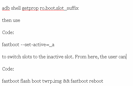 to get into TWRP. Once in TWRP they can then go to the reboot page and change back to their originally active slot, make a backup, then install TWRP. Using the inactive slot allows users to get a good, unmodified backup of their device before installing TWRP.