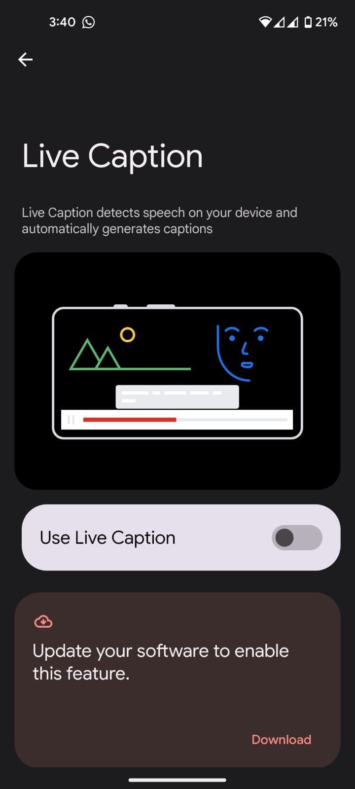 - Live Caption not appearing: Ensure your device’s volume is not muted. Live Caption only works when the device’s volume is on.