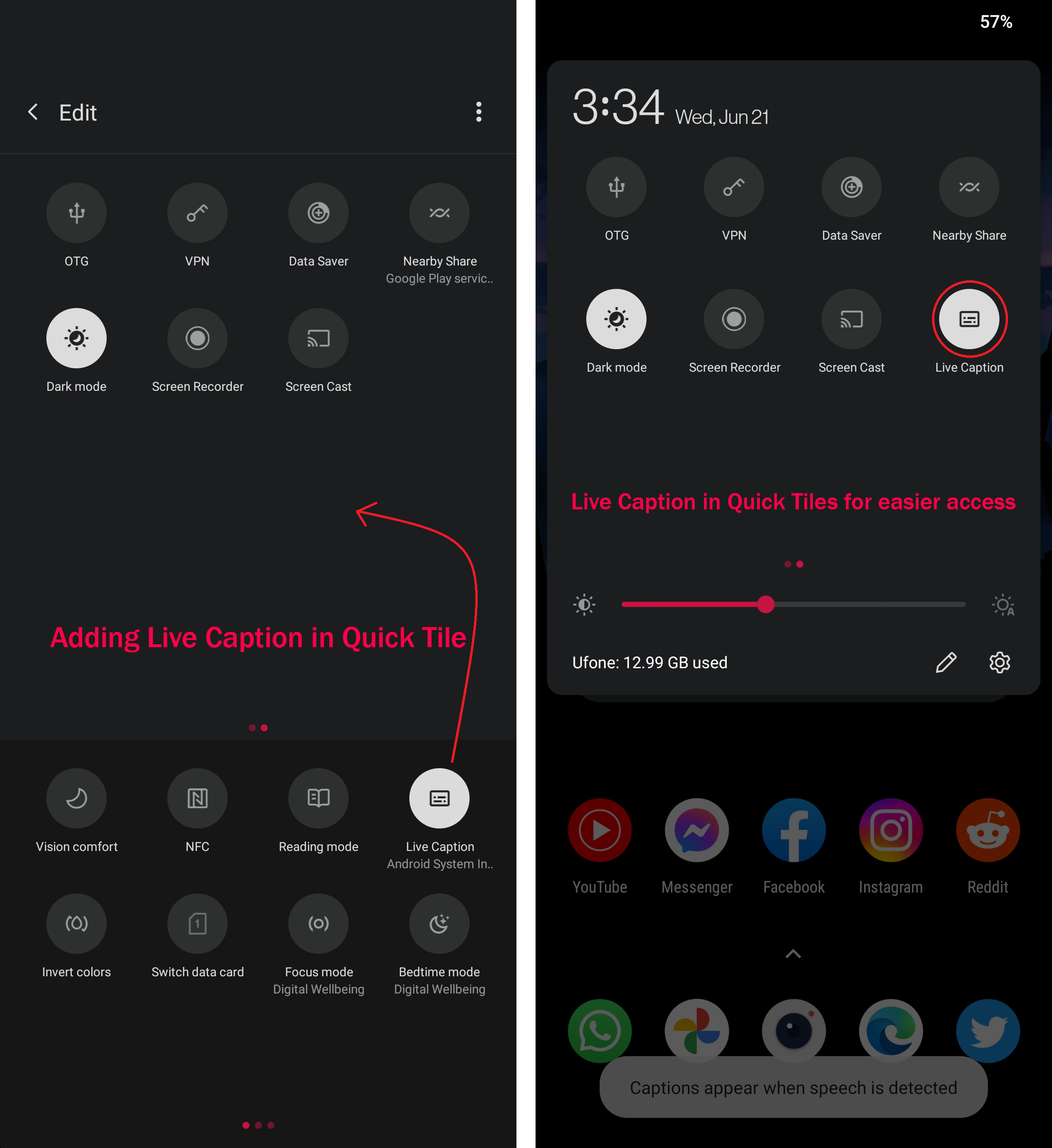 3. Turn off Live Caption via the quick tiles: Swipe down from the top of the screen twice to open the notification shade. Then, find the tile for Live Caption. Drag it to your Quick Tiles, and then, toggle the switch to Off.