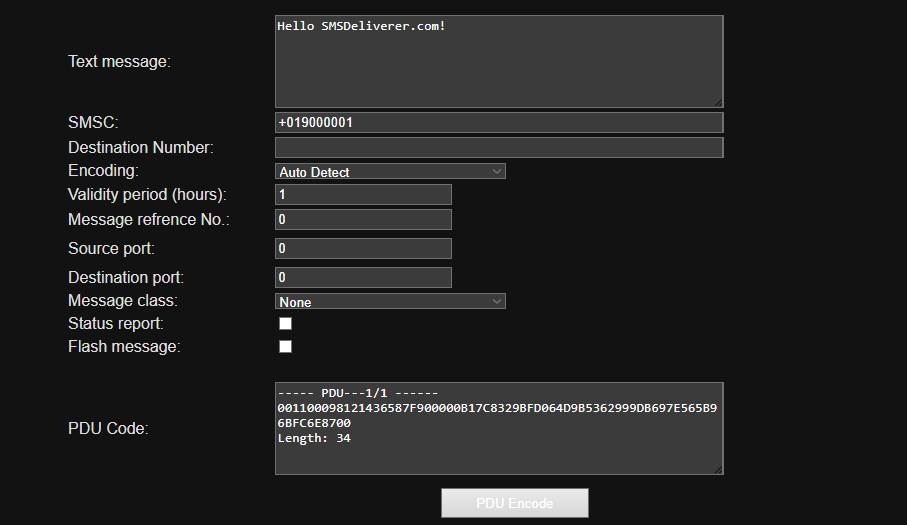 - Enter the PDU string in the SMSC field and press Update. If unsuccessful, prepend a + to the PDU string.
