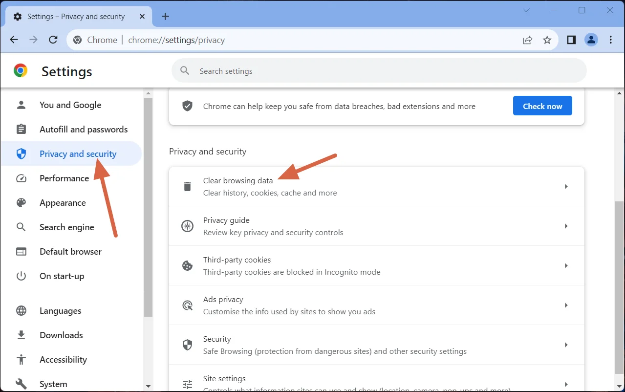 - Select the Privacy and Security tab, then click on Clear browsing data.