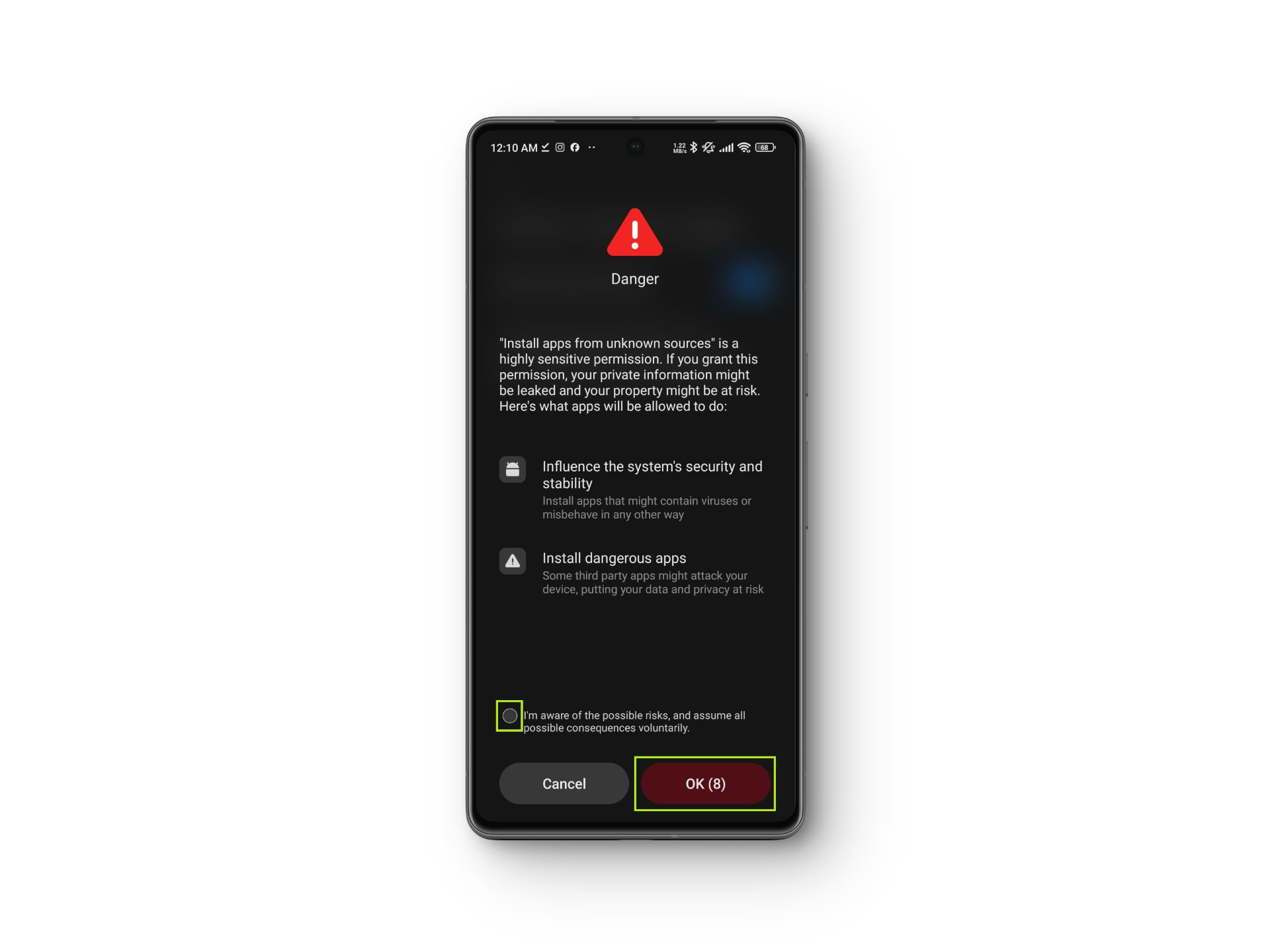 Xiaomi is renowned for prioritizing user security to ensure the safety of their data. Due to this commitment, it maintains a vigilant stance towards unknown external sources. It will once again prompt a warning on your screen. Check the box for I’m aware of the possible risks and assume all possible consequences voluntarily and wait for 10 seconds before tapping OK.