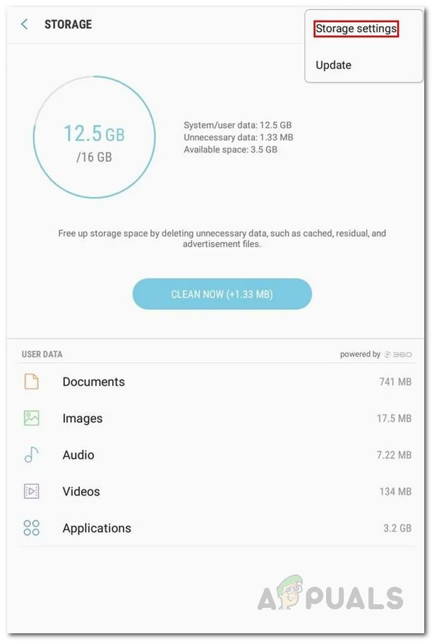 - Then, on the Storage screen, tap the three dots at the top-right corner and then choose Storage settings.