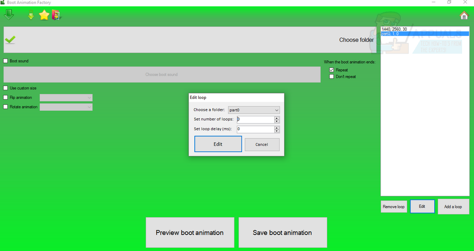 Next, press the ‘preview loop button’ to see that the animation is working properly and then click the ‘save loop button.’ Save it as ‘bootanimation.zip’. Next click the thick green arrow in the top left corner. From here, click the Boot Animation > Flash to Phone option.