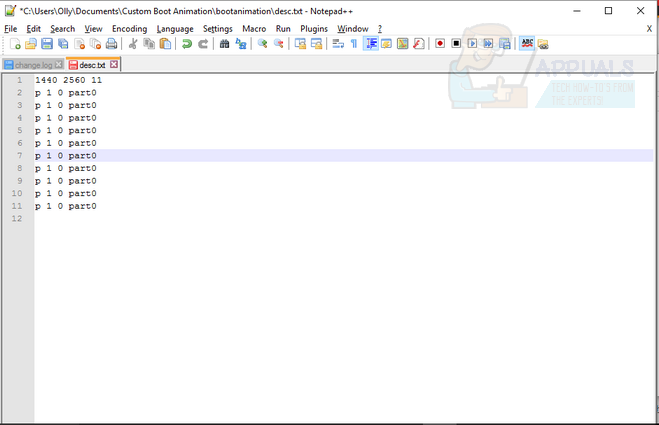As seen in the image above, you will need twelve separate lines within the Notepad file. The first line is used to determine the boot animation width, height and frame rate. The width/height should be the same dimensions as your display resolution found on GSMarena earlier. In this case with the LG G4, we have 1440 x 2560. Frame rate can be adjusted to fine tune the animation, but we’d suggest anywhere between 11 and 30.