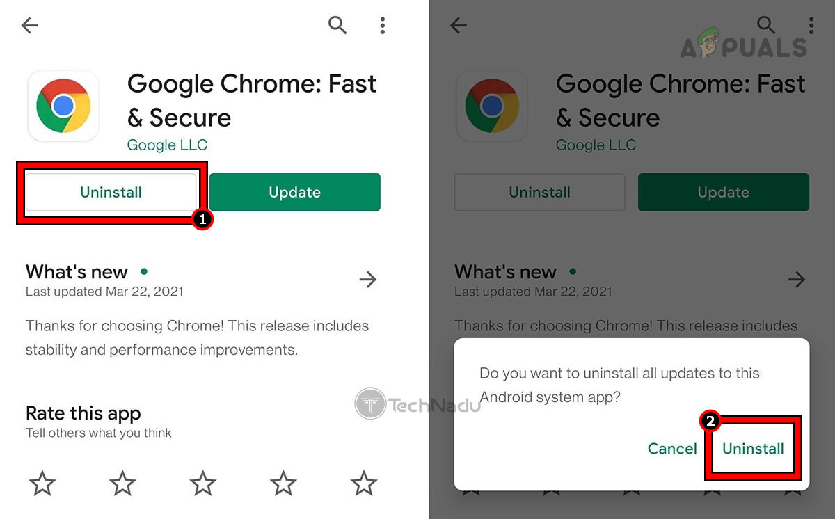 2. Tap on Uninstall or Uninstall Updates and, once done, restart your phone. Uninstall Chrome
