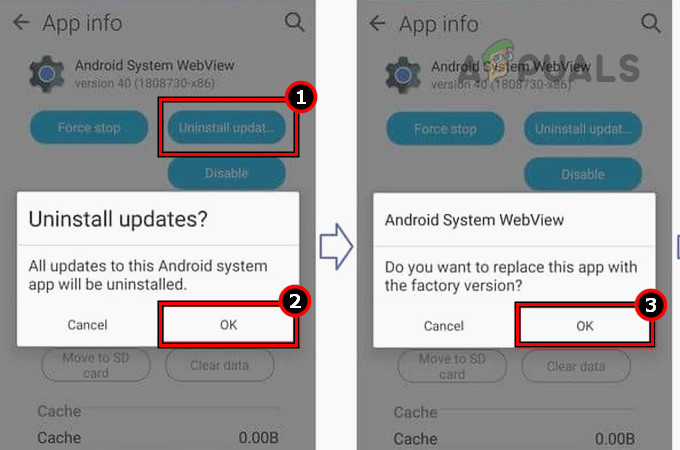 4. Hit the back button and tap on Uninstall or Uninstall Updates (whichever option is displayed). Uninstall Updates of the Android System WebView Through the Device Settings