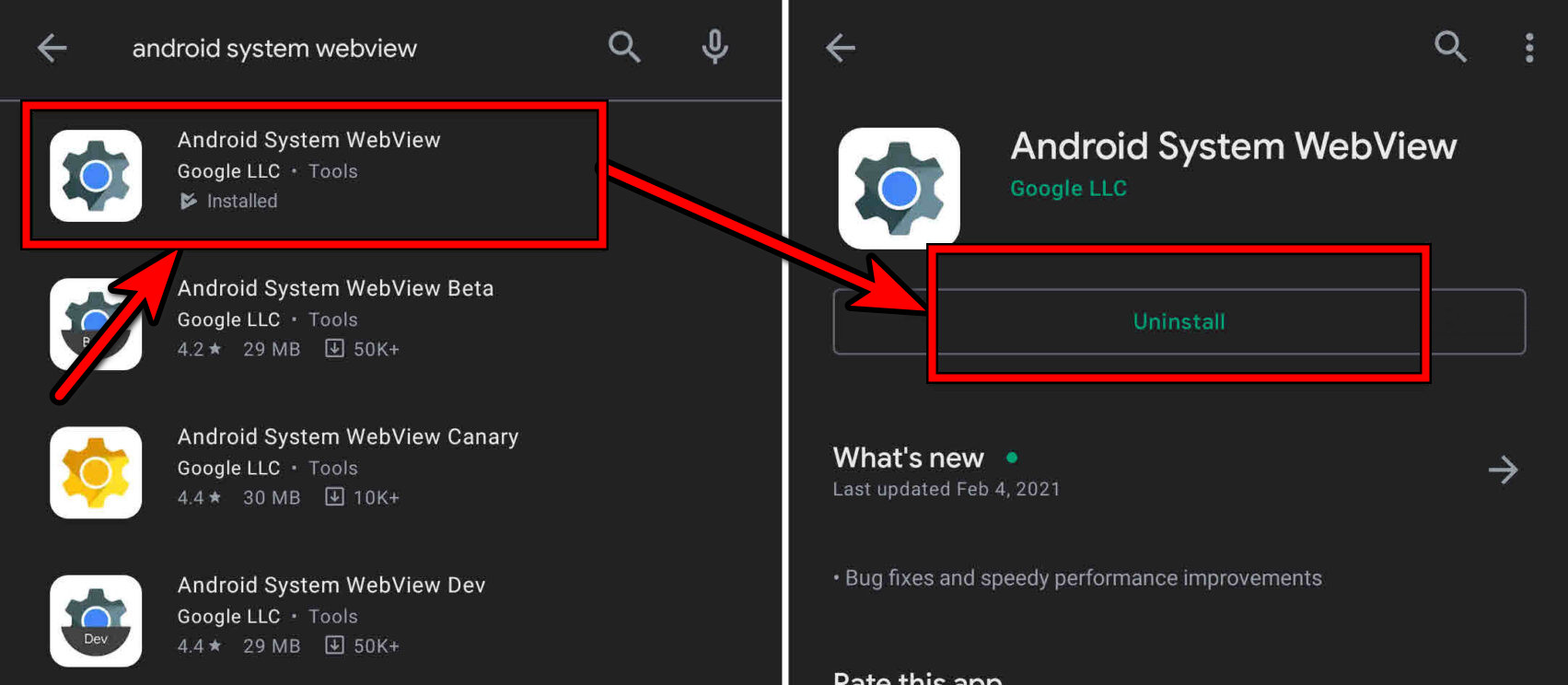 If you cannot locate Android System WebView in the device settings, you can uninstall it through the Play Store.