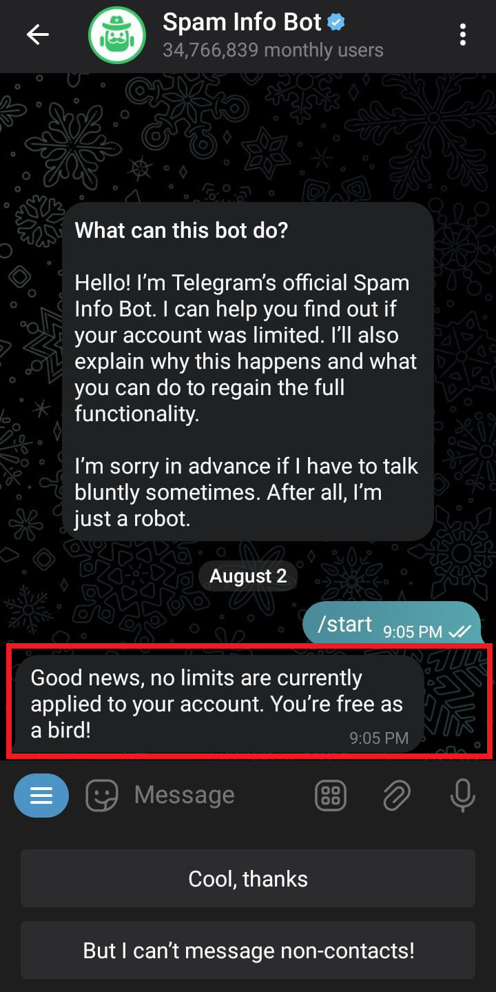 Telegram applies different types of restrictions, such as messaging limits, channel/group restrictions, and NSFW content restrictions, to ensure community safety. However, sometimes these restrictions are applied by mistake. In such cases, you can submit an appeal using @SpamBot if you are eligible.