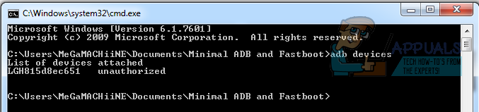 Next, type ‘adb devices’ into the command prompt. You should see your device like below if you have correctly followed the steps above. If it did not appear, try repeating the steps above and ensure you have installed the LG PC drivers.