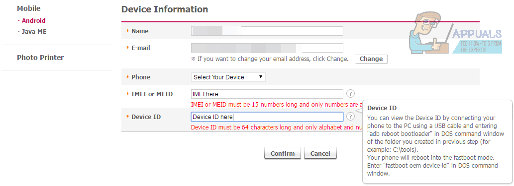 Then, enter the IMEI and device ID into the corresponding boxes on the LG developer website