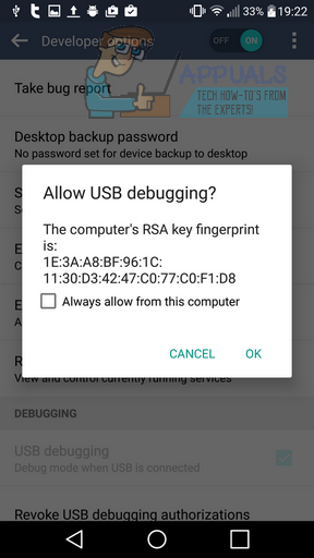 First though, grab your LG G4, head to settings, then visit the developer options (under system). Ensure developer options is turned on and check the USB debugging box. Press OK to the pop-up prompt.