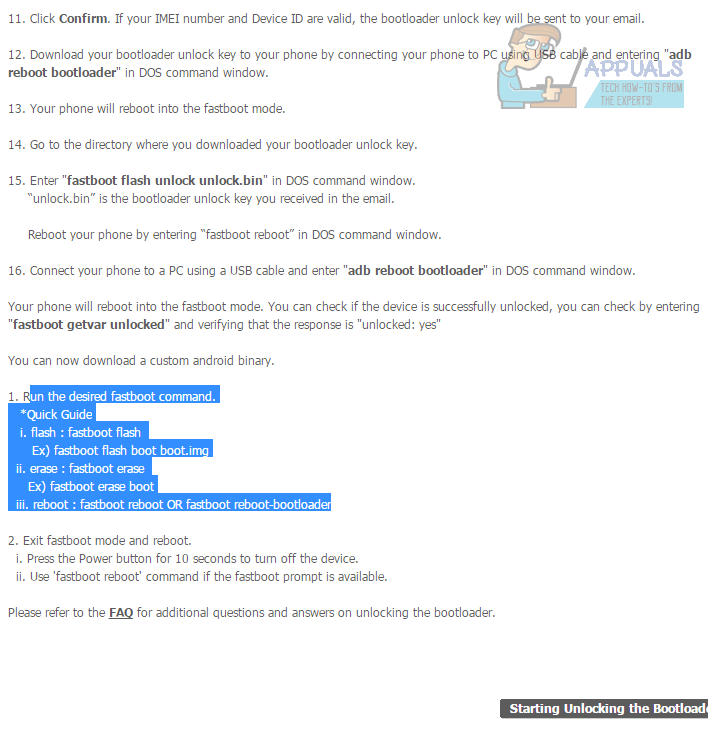 Scroll to the bottom and click ‘Starting Unlocking the bootloader’