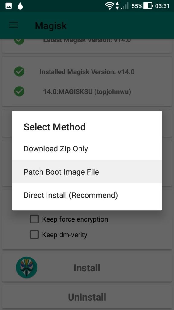 - Once Magisk Manager is installed, launch it. Select Install > Select and Patch File > choose the tar.md5 file you copied to your internal storage.