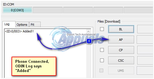 Then on your Computer run ODIN and connect your device to the laptop/computer using the USB cable, once connected you should see a highlighted blue-box, indicating that the device has been connected to ODIN, if you do not see this box then you probably need to download Samsung USB drivers for your computer from here.